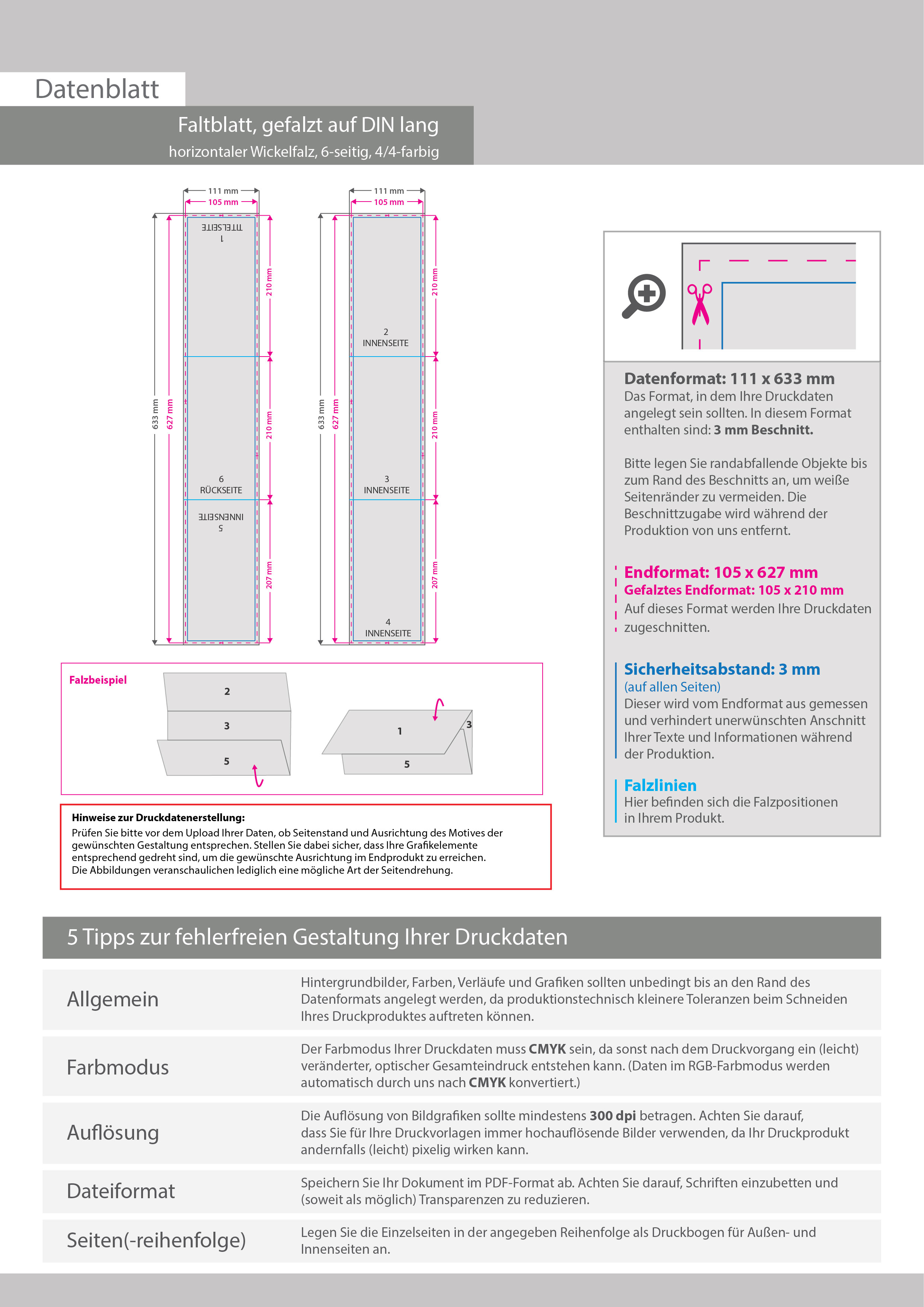 Faltblatt, gefalzt auf DIN lang, horizontaler Wickelfalz, 6-seitig